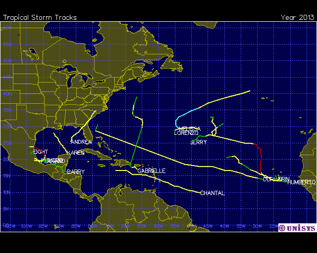 Les systèmes sont repérés (et prénommés alternativement fille ou garçon) lorsque les vents sont supérieurs à 33 nœuds. Les ouragans présentent des vents supérieurs à 63 nœuds. Nous avons pour l’instant en 2013, 13 systèmes cycloniques dont 2 ouragans : Humberto et Ingrid – trajectoires ci-après.