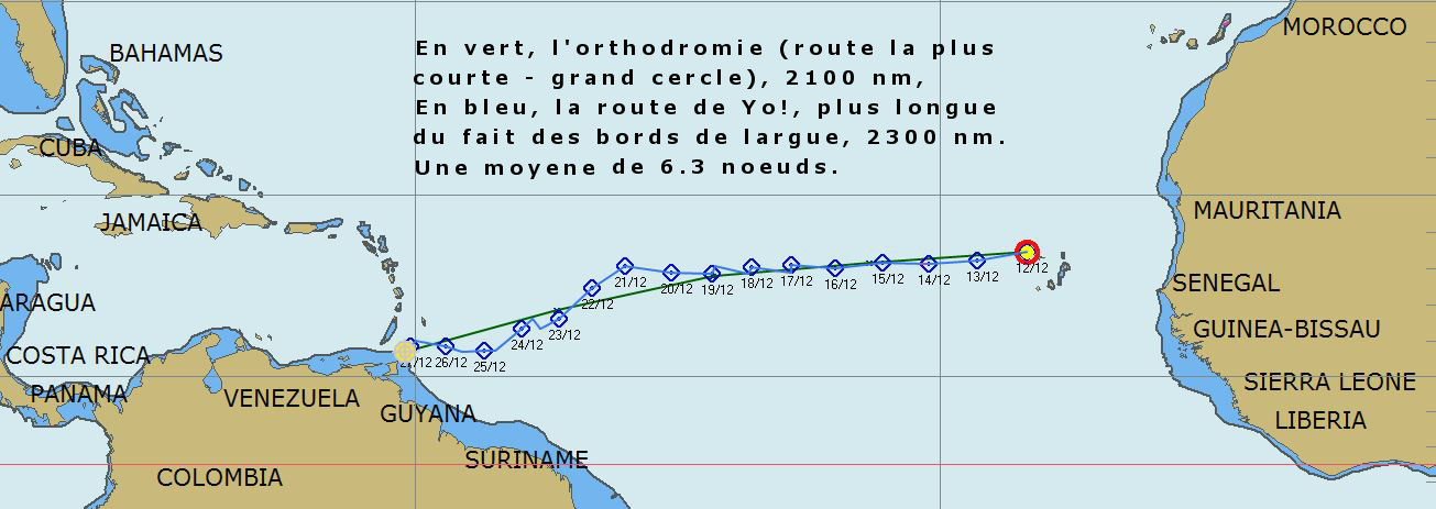 L’arbitrage du départ ayant été contraint par la présence intrusive du vendredi 13 dans le planning (pas vraiment superstitieux, mais enfin d’aucun ont entendu parler du pari de Pascal), amarres larguées le jeudi 12, 14h. La navigation s’est effectuée sur quinze jours (et 6 heures pour être précis), un total de 2 300 miles parcourus pour une route optimale (orthodromie) de 2  100nm soit 200 nm de trop (bords de largue pour suivre le vent ou bien fuite lorsque la brafougne montait). Cette navigation pourrait être qualifiée de velue compte tenu des conditions avec une rafale ayant tiltée les 51 noeuds mais surtout des vents moyens aux alentours de 30 nœuds et de la grosse zoule. En bref, pas pour les petites filles.
