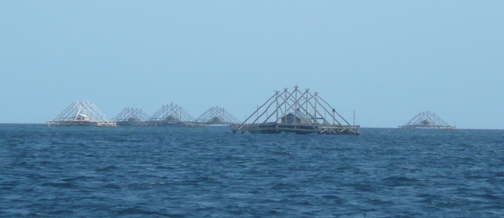 Kei Islands – Plateformes de pêche. Elles sont autopropulsées, restent en place deux/trois jours, la cabane abrite un gardien, puis l’équipage relève filets et lignes à calamars (cumi-cumi).