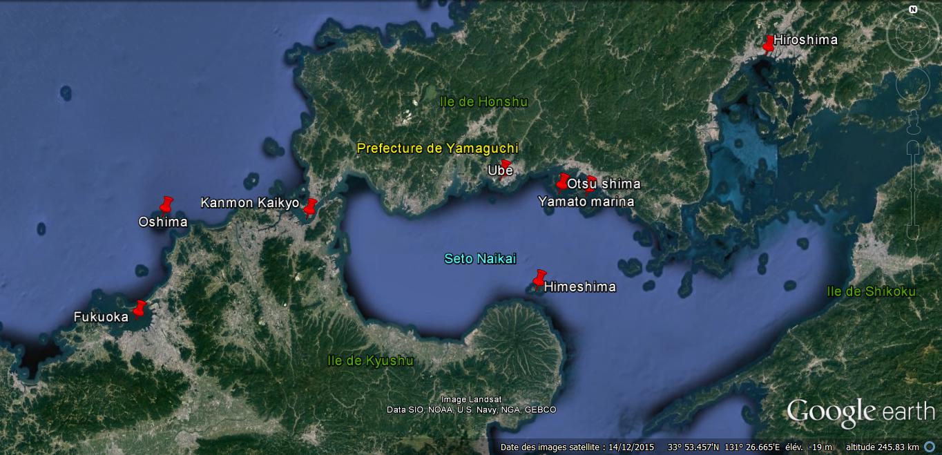 L’entrée dans la Seto Naikai par le Kanmon Kaikyo, une des trois passes qui permet au grand lac coincé entre les îles de Kyushu, Honshu et Shikoku, de respirer au rythme des marées (jusqu’à 4 mètres de marnage), nous a donné l’occasion d’apercevoir une face industrielle du Japon. Bénéficiant d’un emplacement favorable au pied des montagnes, au bord d’un axe de transport sécurisé jusqu’à Osaka, le littoral étroit de la préfecture de Yamaguchi a été sacrifié à l’implantation des chantiers, aciéries et usines lors de l’industrialisation forcée de l’ère Meiji. Après la défaite de 1945, dans un contexte de guerre froide déplacée de l’Europe vers l’Extrême-Orient et accru par la « menace » communiste en Chine, les Américains qui occupent le pays jusqu’en 1952 encouragent une reprise économique rapide. Pour le Japon, privé de dépenses militaires structurantes en raison du Pacifisme imposé, la guerre de Corée donne un coup de fouet grâce aux commandes de l’armée Américaine, les conglomérats d’avant-guerre sont bien vite reconstitués…