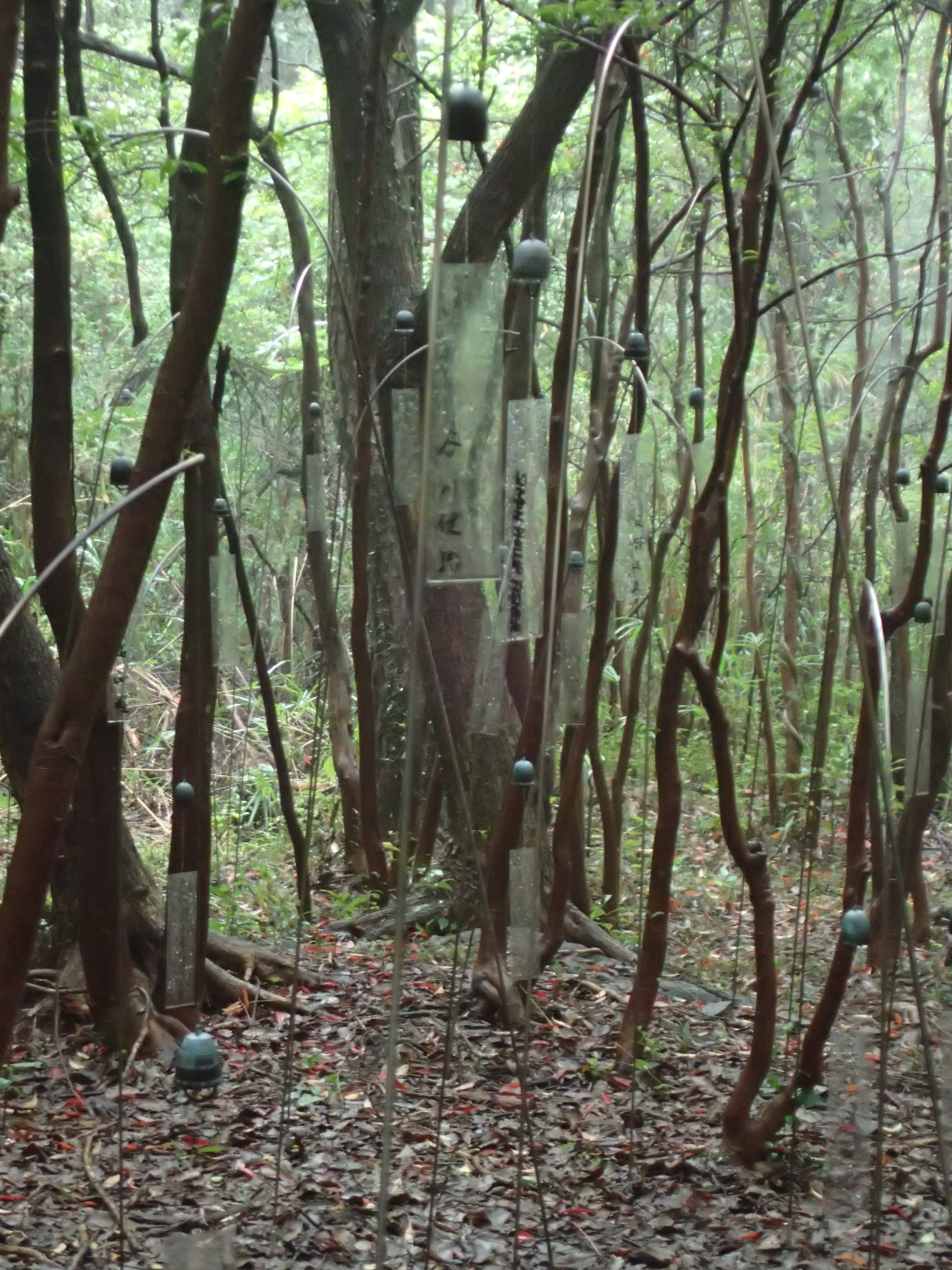 Au fin fond de la forêt, une plaque transparente qui porte le nom d’une personne décédée est accrochée sous chaque grelot. Dans une pure tradition bouddhiste, le vent rend ainsi hommage à l’âme du défunt.