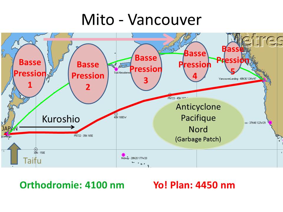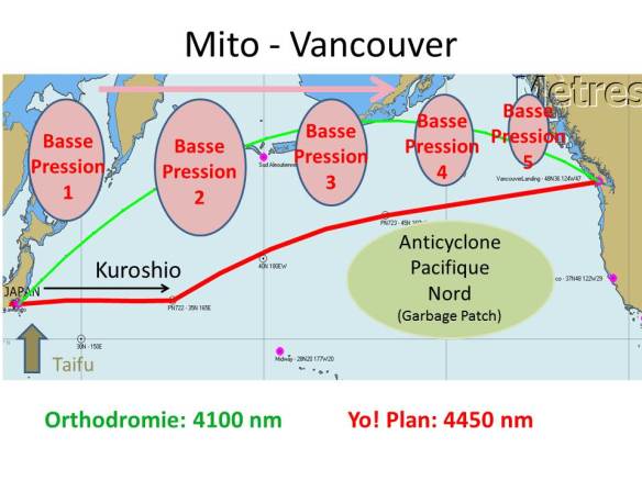 La partie de la route qui consiste à quitter les cotes japonaises le long du 35°N jusqu’au 165°E est la plus difficile en raison des coups de vent brutaux perturbés par l’archipel Nippon qui occasionnent de nombreux détours, font vent contre gros courant.