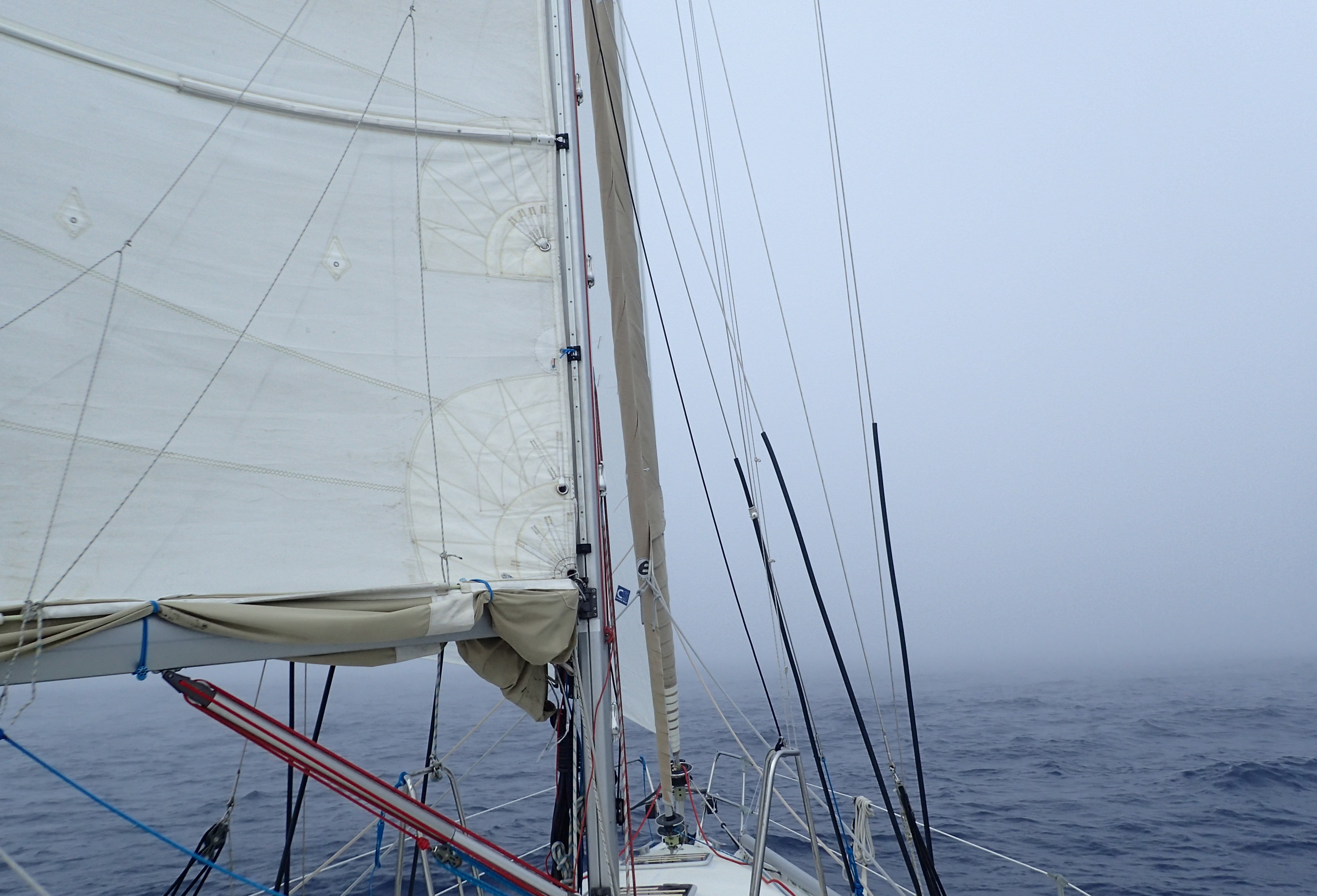 La deuxième partie, courte conduit à remonter en diagonale jusqu’au 40/45°N et la ligne de changement de date pour aller prendre les trains dépressionnaires, ce sur fond de brouillard à couper au couteau.