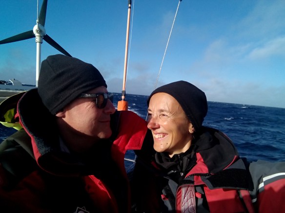 19h : Est 15-20 kts, la mer lève -mise à la cape en attendant que ça rotationne et premières gouttes de pluie. Inutile de descendre plus au Sud, même si le Sud toujours en été on voudrait que ça dure un million d’années… et tout ça et tout ça. Nous, têtus, on vise de l’Est.