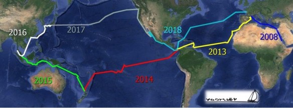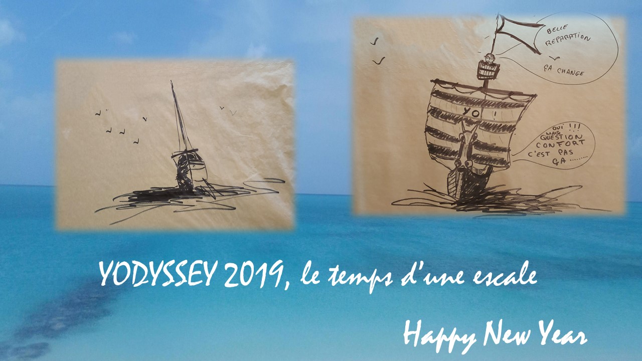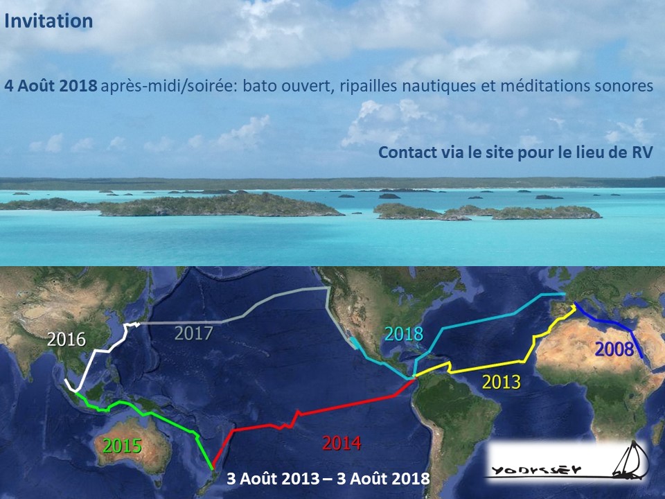 Les « Longues routes pacifiques » sont finies, [téléchargeable (pdf) ici : Yodyssey – Tome 5 – Longues routes pacifiques 2014-2017], recueil magique qui s’adresse aux marins initiés, à ceux que le lent balancement de la houle berce des jours durant, à ceux que la mer forte et, bien sûr, croisée, emporte en fuite vers des ailleurs rêvés ou redoutés, à ceux qui estiment n’être jamais à plus de 5 miles de la côte (en vertical s’entend au plus profond des grandes fosses océaniques), à ceux qui connurent ou imaginent le lent dérèglement des sens causés par l’accumulation de roulis, de tangage, de fatigue, de privations, à ceux que n’effraient pas ces moments fugaces où la raison vacille, où les mots prennent vie pour nourrir les idées, où l’on commence à douter de sa propre santé mentale.