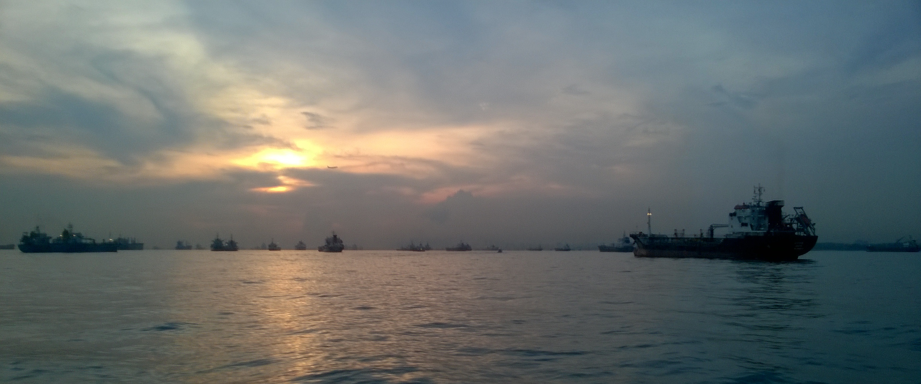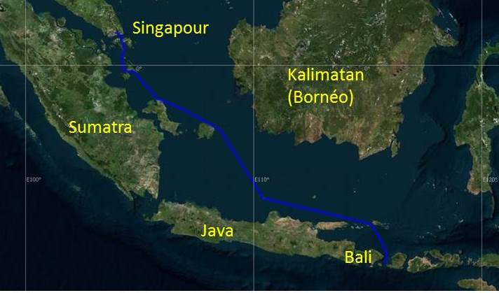 Le 19 novembre 2015, « Yo! » se faufile dans la succession ininterrompue de cargos sur le rail le plus fréquenté du monde au droit de Singapour et s’amarre sur un coffre au Changi Sailing Club. La route, de l’archipel de Karimun Java lieu de villégiature des Javanais à celui de Riau, arrière-cour et atelier de Singapour impose de zigzaguer dans les flottilles de pêcheurs. La navigation sur des fonds inférieurs à 60 mètres et la désespérance liée à l’absence de vent au large de Belitung, coincée entre Sumatra et Kalimantan (Bornéo) accentue la sensation d’étouffement. Pourtant, la stratégie d’attente du début de la mousson de Nord-Est permet de naviguer alors que les fumées extrêmement denses dues aux incendies des forêts de Sumatra et Kalimantan sont dissipées par les premières pluies.